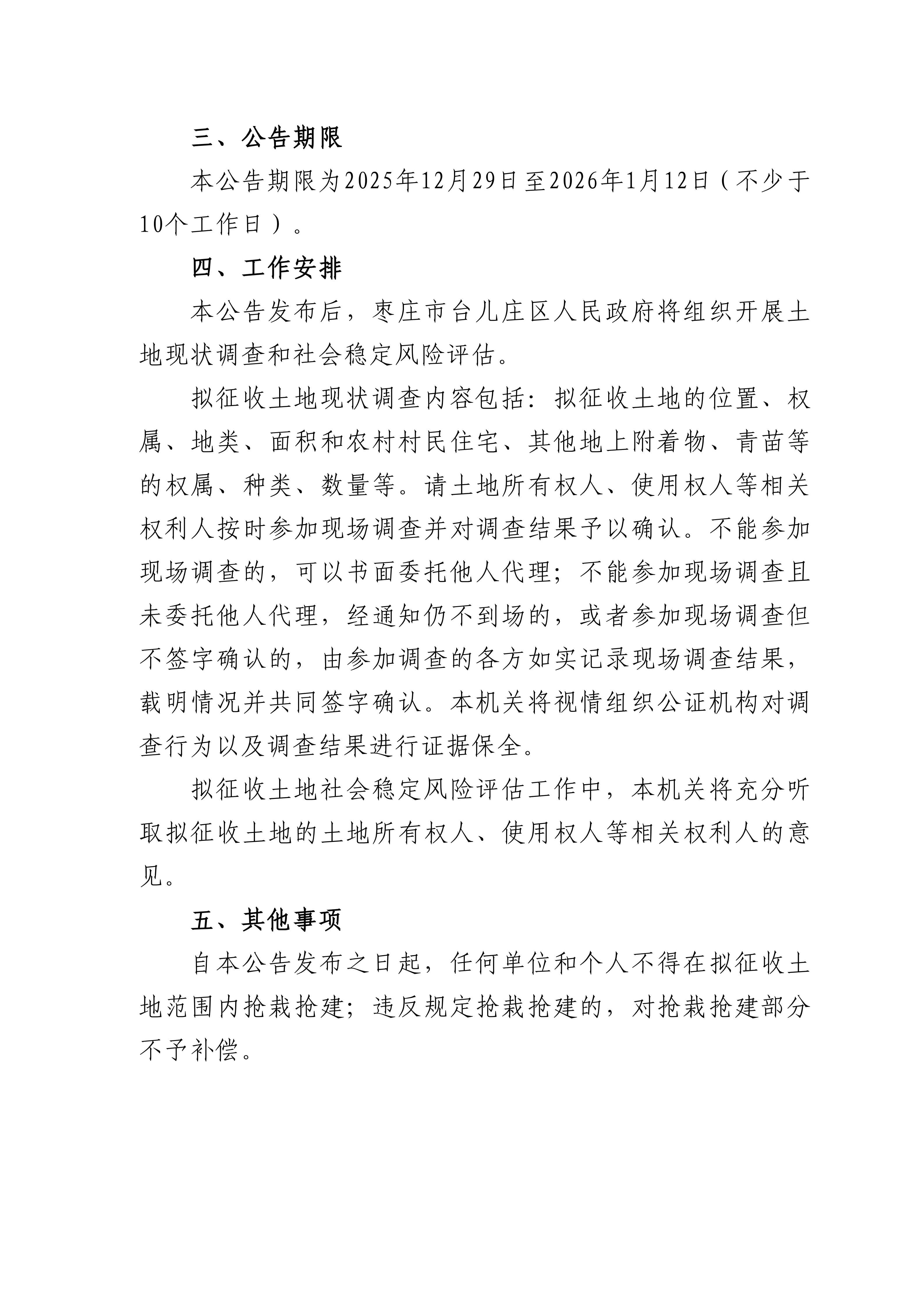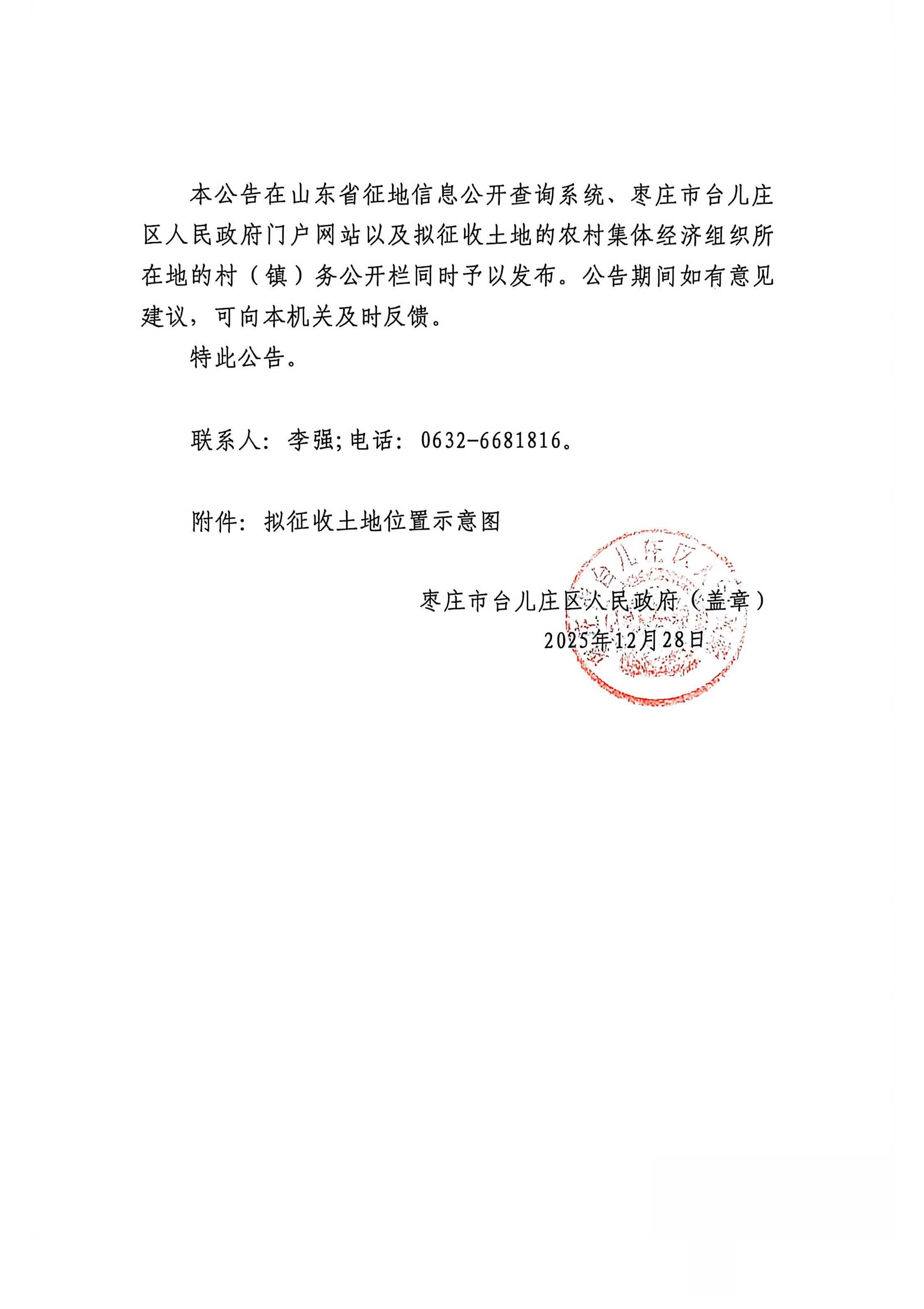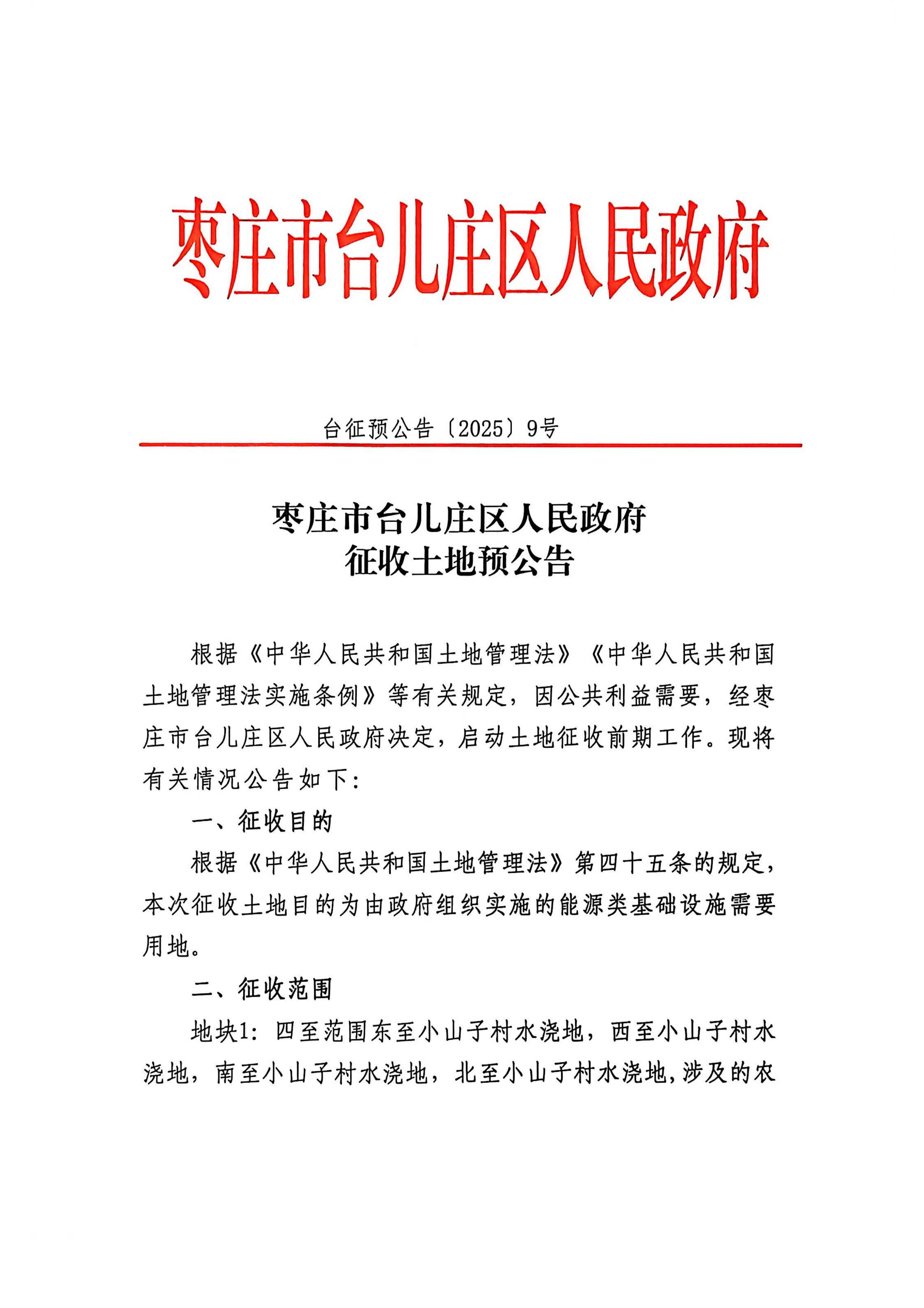 枣庄市台儿庄区人民政府征收土地预公告 台征预公告〔2025〕9号