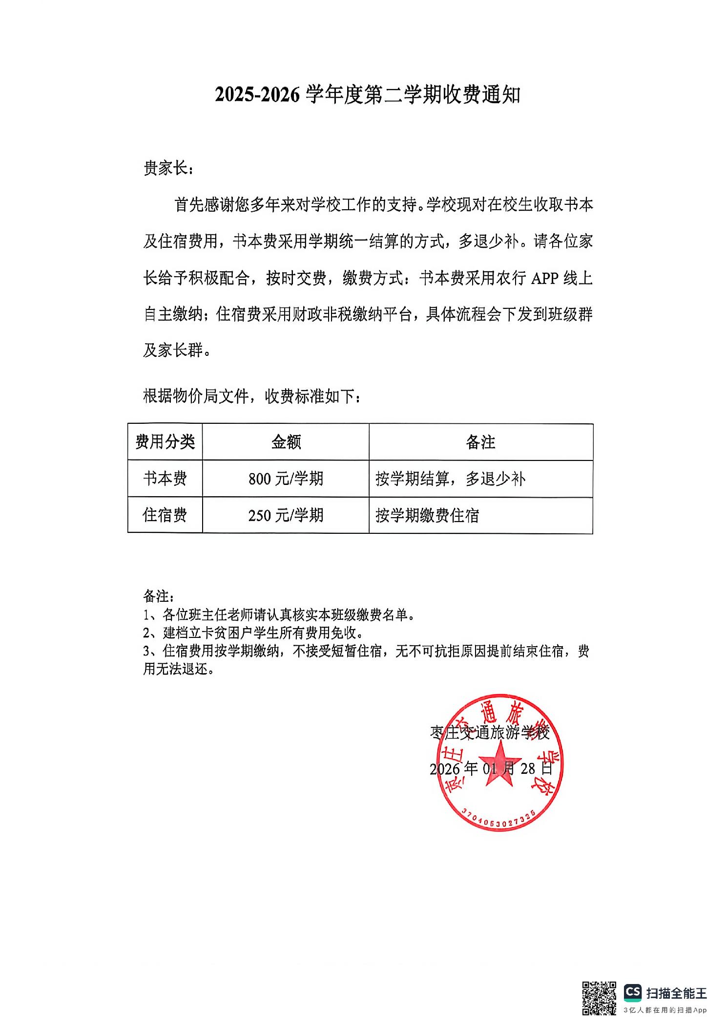 【收费信息】学校2026年春收费信息