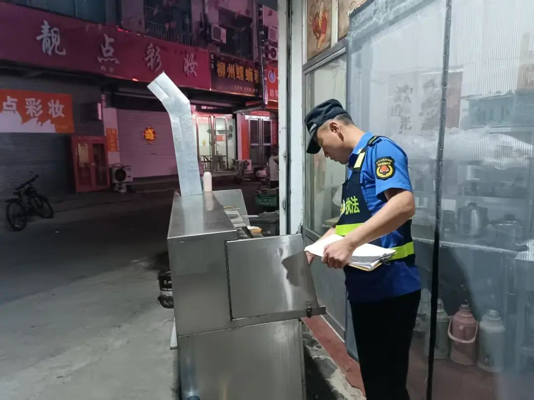 执法人员对辖区内餐饮门店及便民摊点进行巡查,重点检查商户油烟净化设施的安装情况、正常使用状态、排烟管道密闭性与清洁程度,以及相关清洗记录和油烟监测报告等事项,确保其正常运行并达到排放标准;同时,引导露天烧烤入店经营、规范经营。