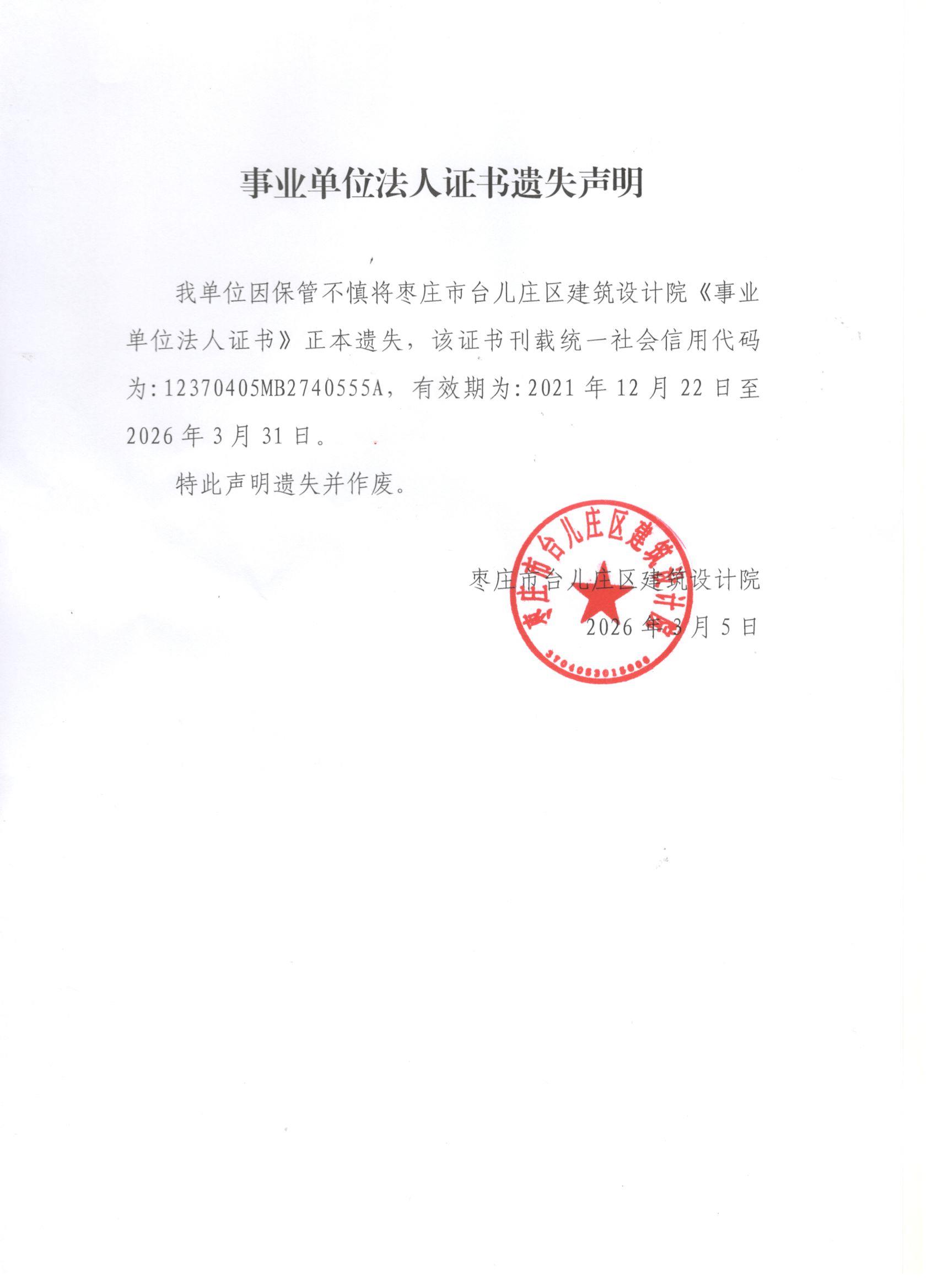 枣庄市台儿庄区建筑设计院事业单位法人证书遗失声明