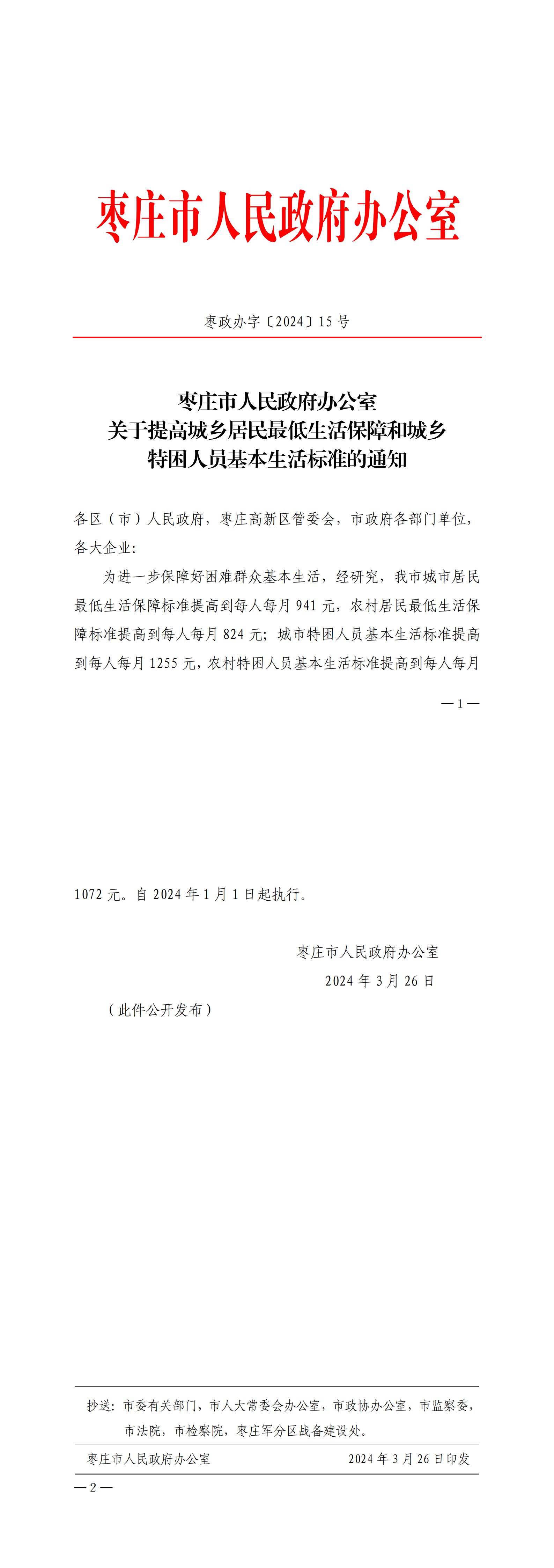 枣庄市人民政府办公室关于提高城乡居民最低生活保障和城乡 特困人员基本生活标准的通知