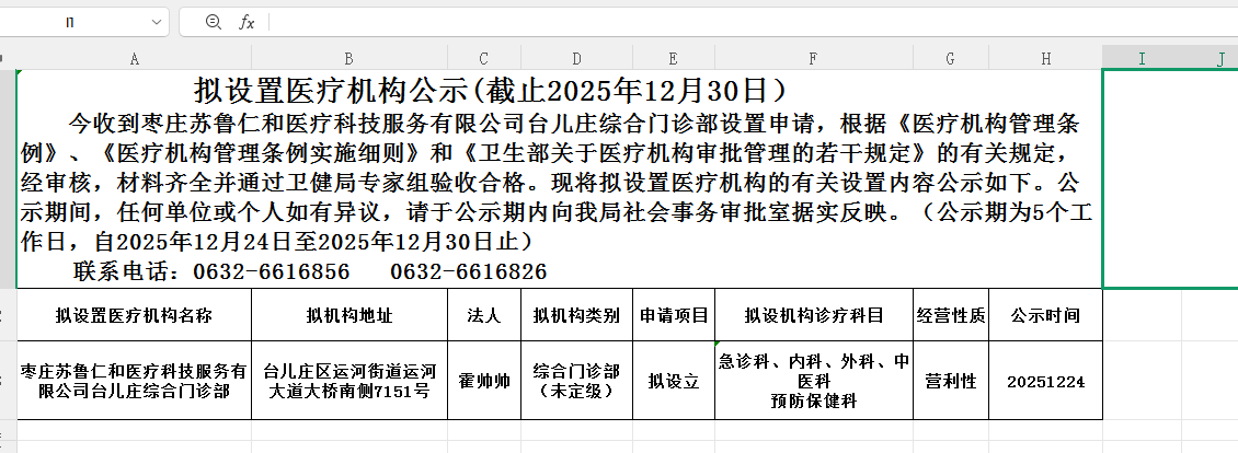 关于枣庄苏鲁仁和医疗科技有限公司台儿庄综合门诊部的拟设置公示