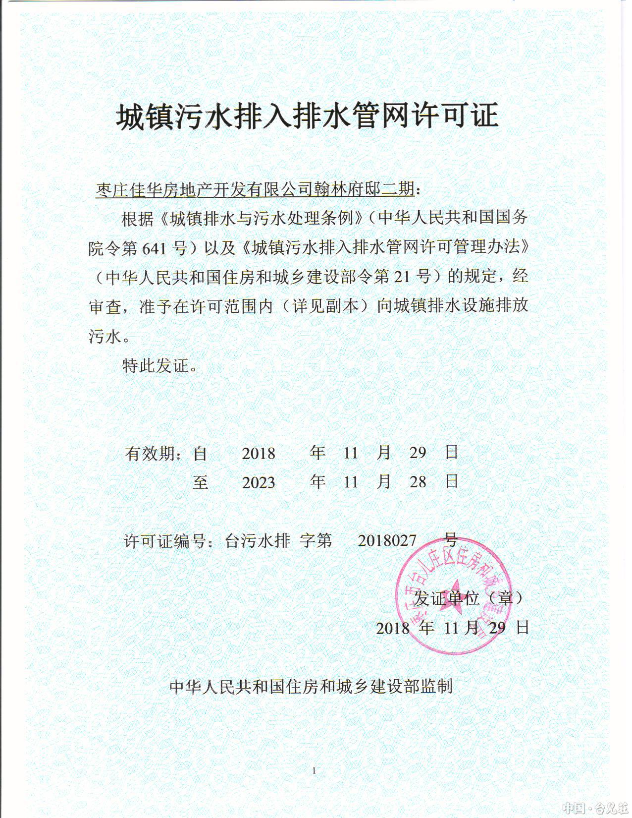 • 标  题:枣庄佳华房地产开发有限公司翰林府邸二期污水排入排水管网许可证
