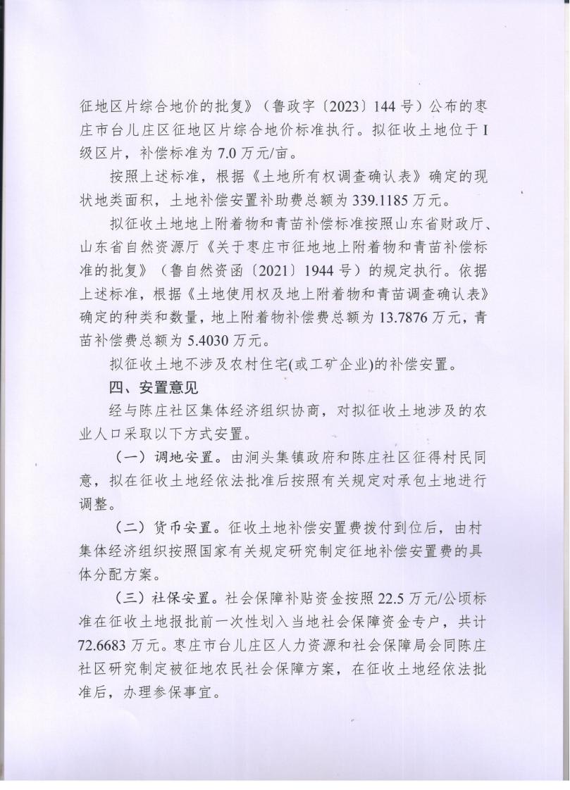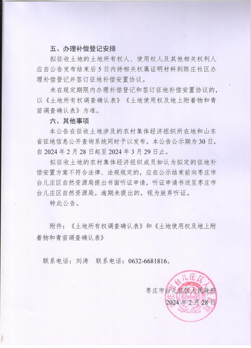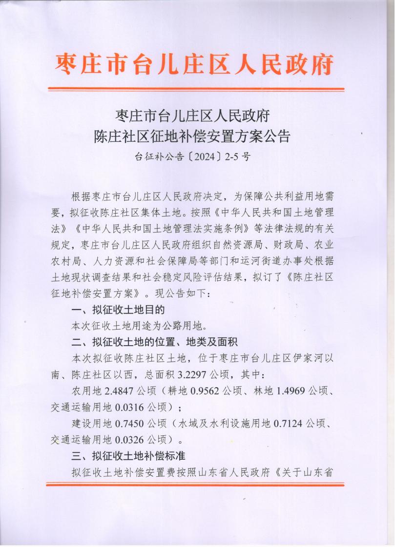 枣庄市台儿庄区人民政府陈庄社区征地补偿安置方案公告台征补公告〔2024〕2-5号
