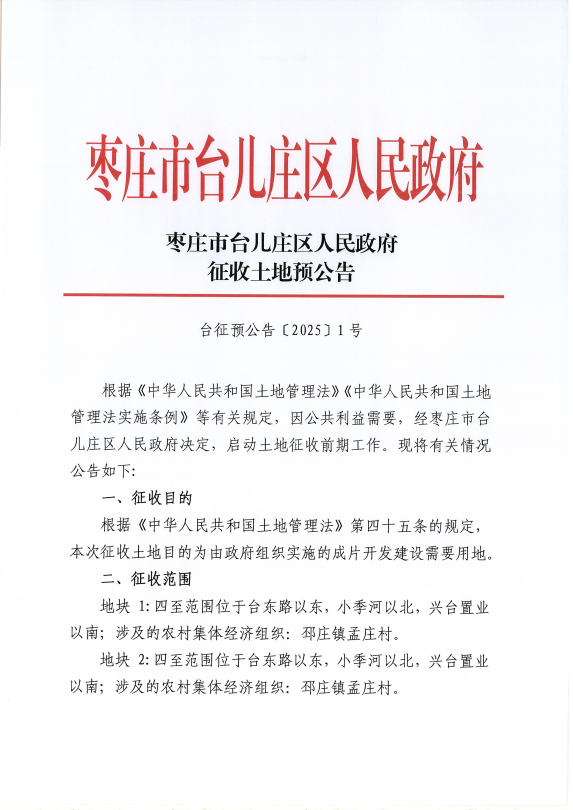 • 标  题:枣庄市台儿庄区人民政府土地征收预公告