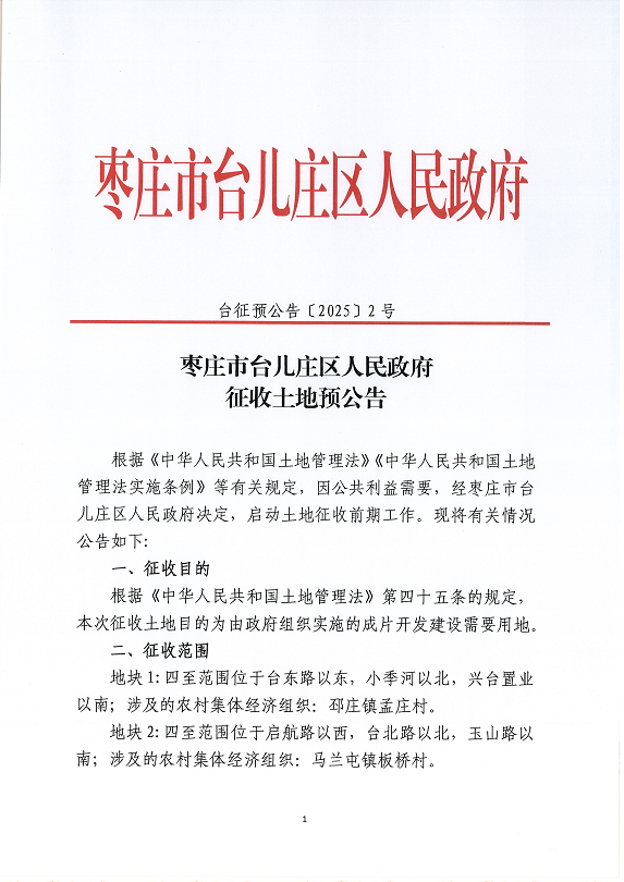• 标  题:枣庄市台儿庄区人民政府土地征收预公告