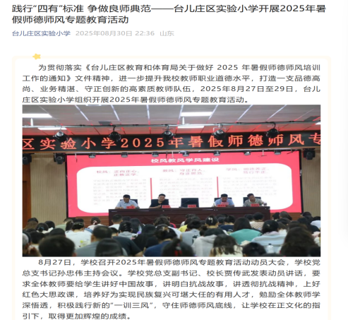 【教师培训】践行“四有”标准,争做良师典范-台儿庄区实验小学开展2025年暑假师德师风专题培训